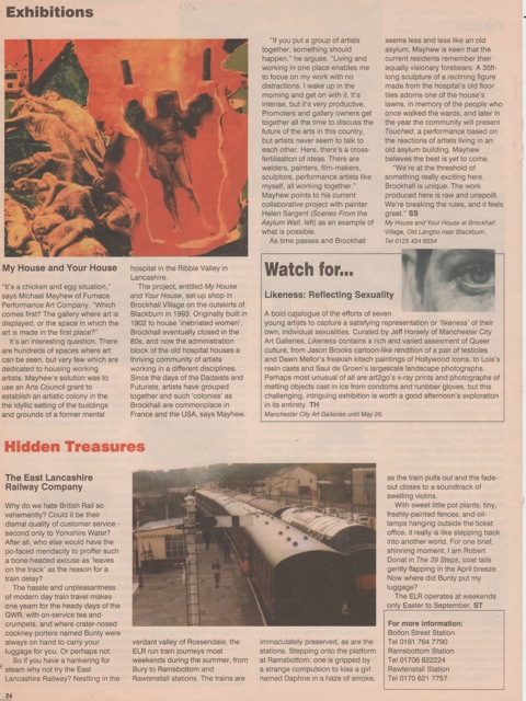 "Between 1995 and 1997, I lived and worked from a studio in the old nurses building at Brockhall Village on the site of a derelict Victorian Asylum together with 30 other artist, including the performance artist Michael Mayhew, who I collaborated with on a number of projects including Scenes from The Asylum Wall."...