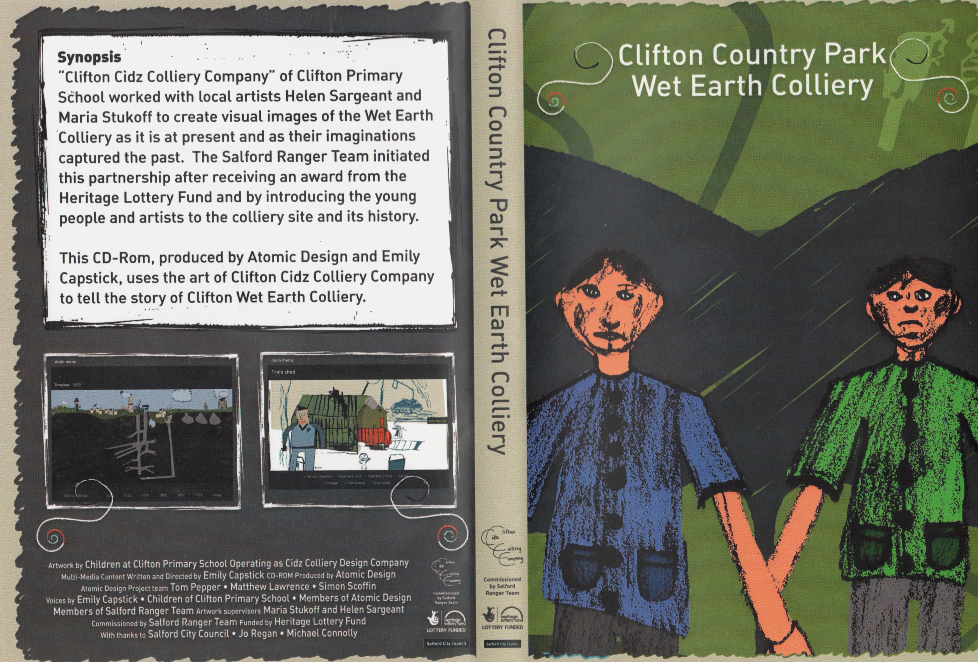 "Collaborated with Maria Stukoff, the children of Clifton Primary School ( "Clifton Cidz Colliery Company"), Salford Ranger Team, Salford City Council and Atomic Design to re-interpretate the site through producing art work to be utilised in an interactive CD Rom."